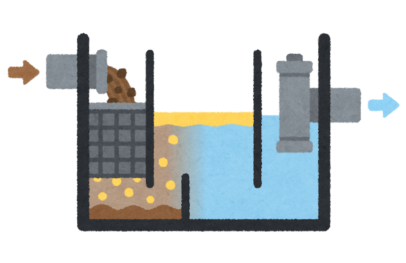 グリストラップの維持管理 – 飲食店などで排出した油分や生ごみ・カスはグリストラップで集めて、廃油の抜き取り・清掃が必要です